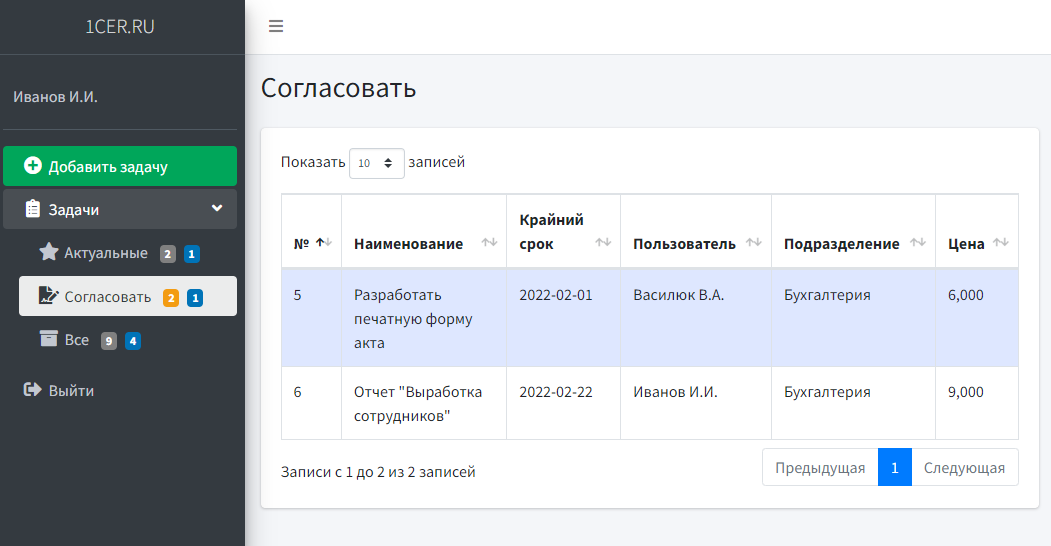 - Аналитика по количеству и стоимости задач в разрезе пользователей и подразделений
